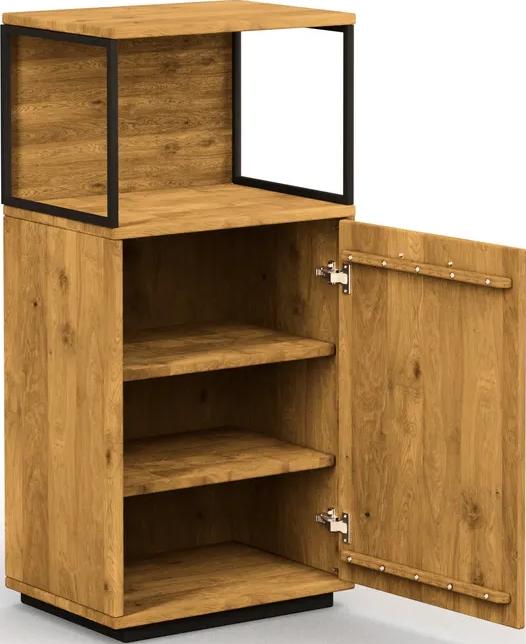 Abmessungen Breite: 55 cm Tiefe: 38 cm Höhe: 115 cm Hauptfarbe/-material Farbe: Holzfarben Material (Variantenachse): Wildeiche massiv Oberflächenverarbeitung: geölt Front Material Details Front: mit Metallrahmen schwarz Korpus Material Details Korpus: durchgehende Lamelle, Rückwand sandgestrahlt Griffe Form Griffe: Bügelgriff Farbe Griffe: Schwarz Material Griffe: Metall Merkmale Anzahl Türen: 1 Dämpfung Türen Anzahl offene Fächer: 1 Hinweise Hinweise: Abweichungen in Farbe, Form, Abmessungen gegenüber den Abbildungen und Angaben vorbehalten Massivholzmöbel können durch Sonneneinstrahlung nachdunkeln Pflegehinweise: Bitte die Pflegehinweise der Hersteller beachten.